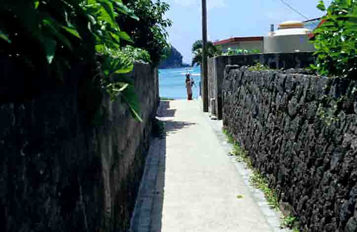 集落の細道から海が見える。